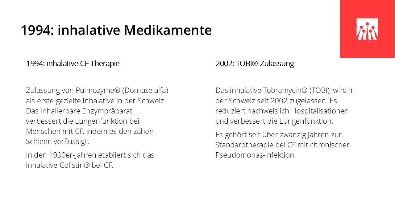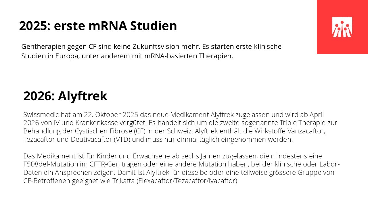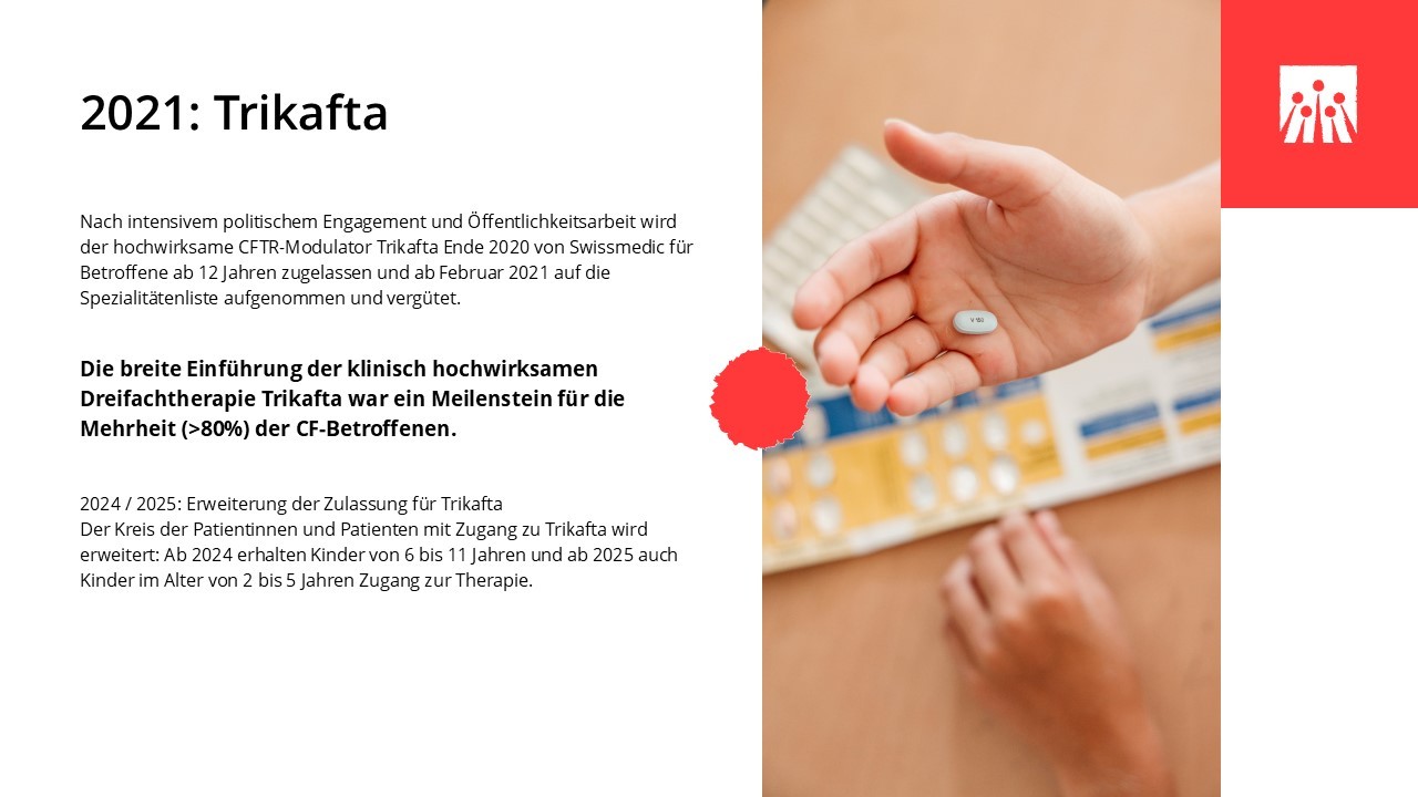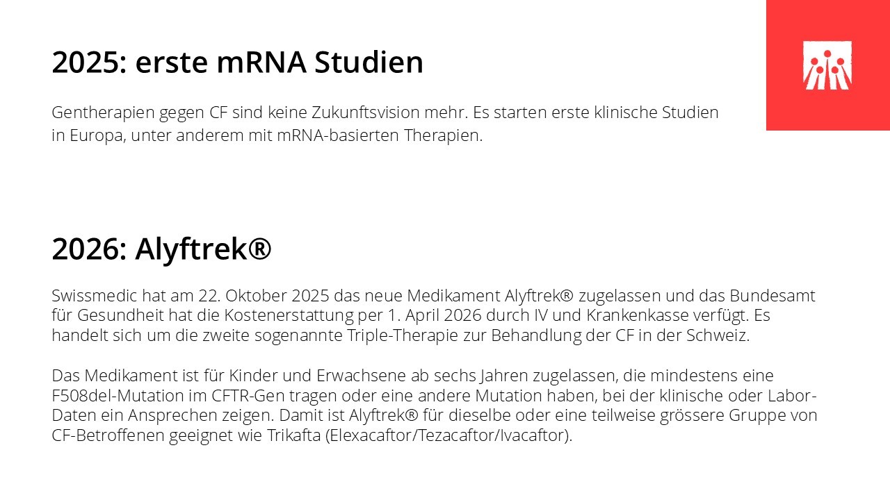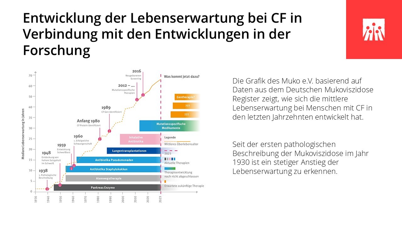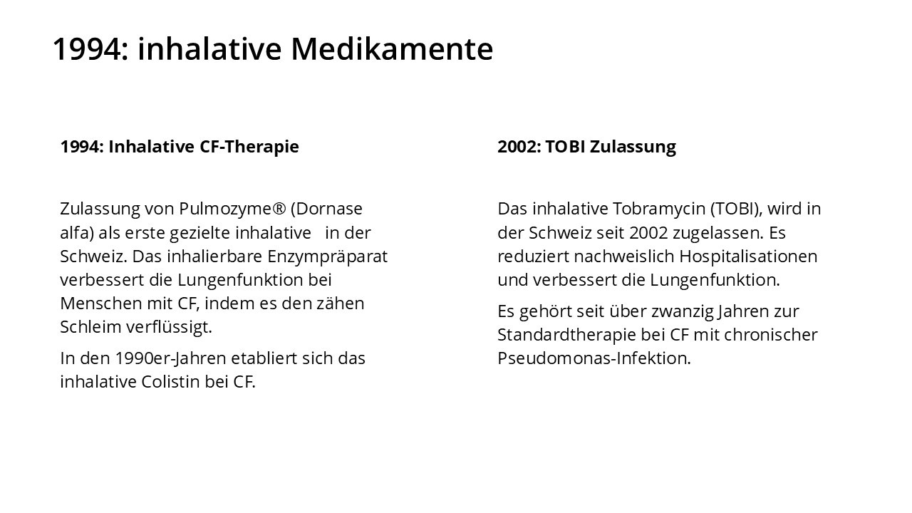 In den vergangenen sechs Jahrzehnten hat sich das Leben mit Cystischer Fibrose grundlegend verändert. Medizinische Durchbrüche, spezialisierte Behandlungszentren und neue Therapien haben die Lebensqualität und die Lebenserwartung vieler Betroffener deutlich verbessert. Entscheidend dafür waren ein wachsendes Verständnis der Krankheit, wirksamere und gezieltere Medikamente und spezifische Therapien wie Pankreasenzyme, Antibiotika und Inhalationstherapien, die Weiterentwicklung der Atemphysiotherapie und der hochkalorischen Ernährung, die Möglichkeit der Lungentransplantation sowie der Aufbau interdisziplinärer CF-Zentren. In den letzten Jahren haben insbesondere die CFTR‐Modulatoren die Behandlung grundlegend verändert, da sie erstmals direkt an der Ursache der Erkrankung ansetzen.