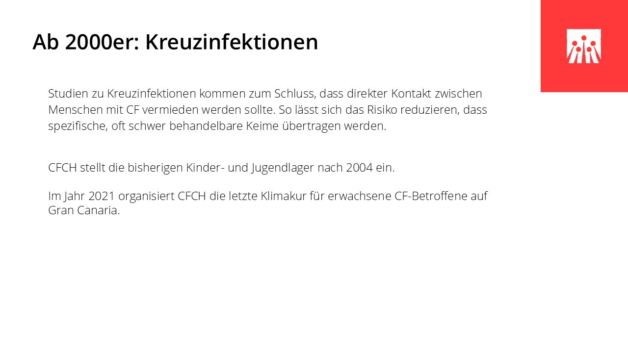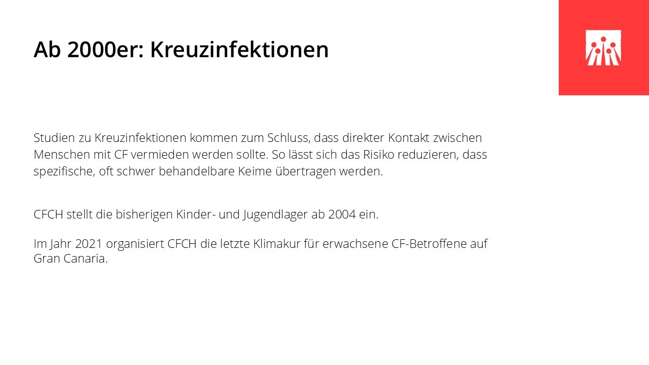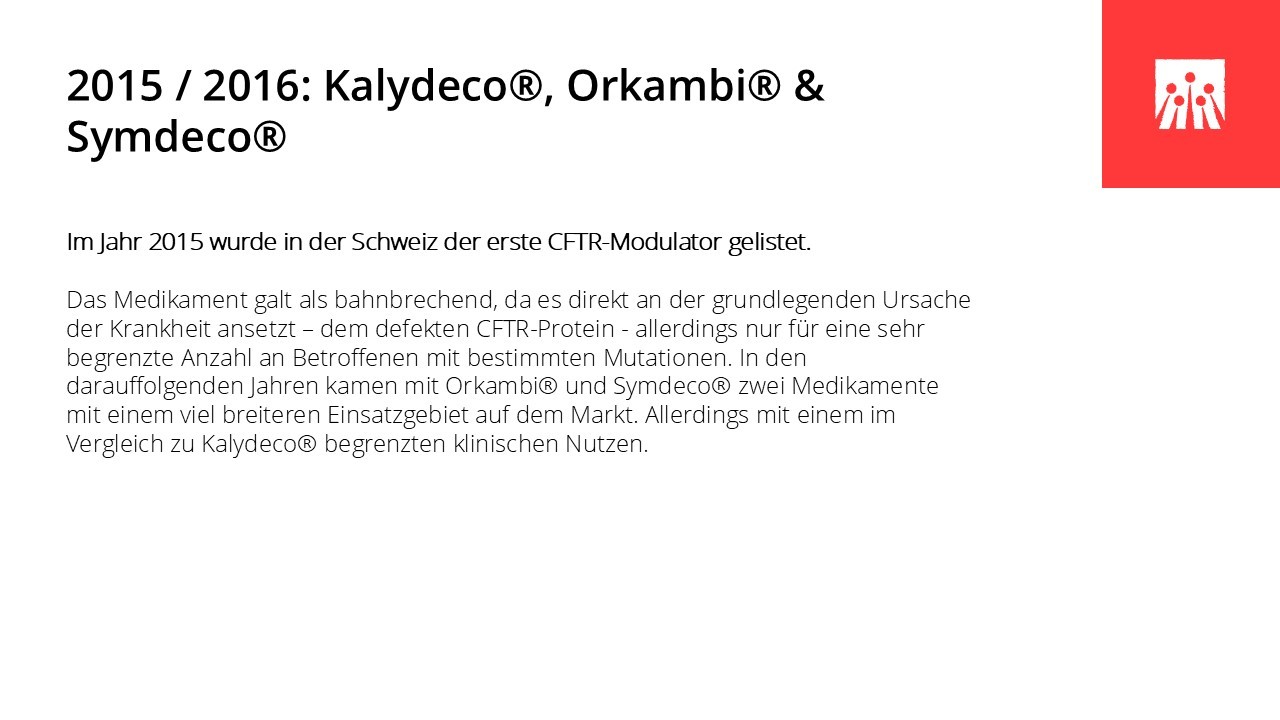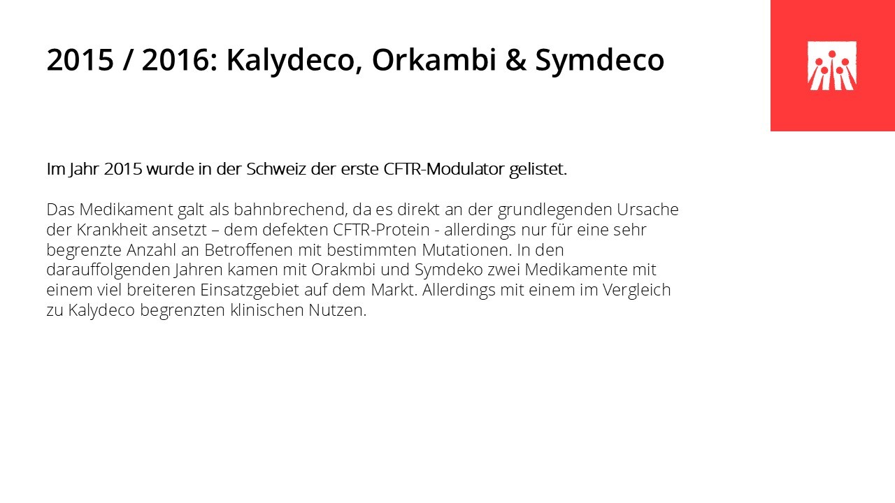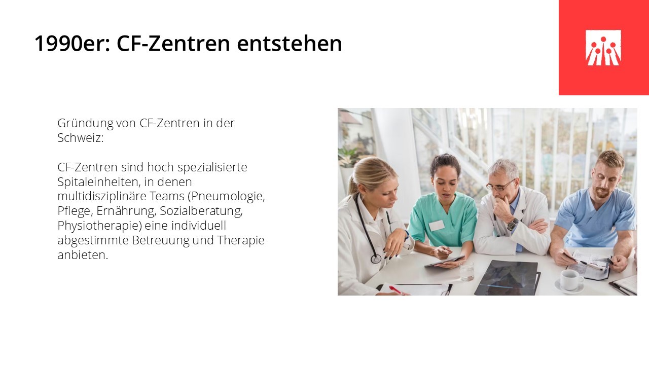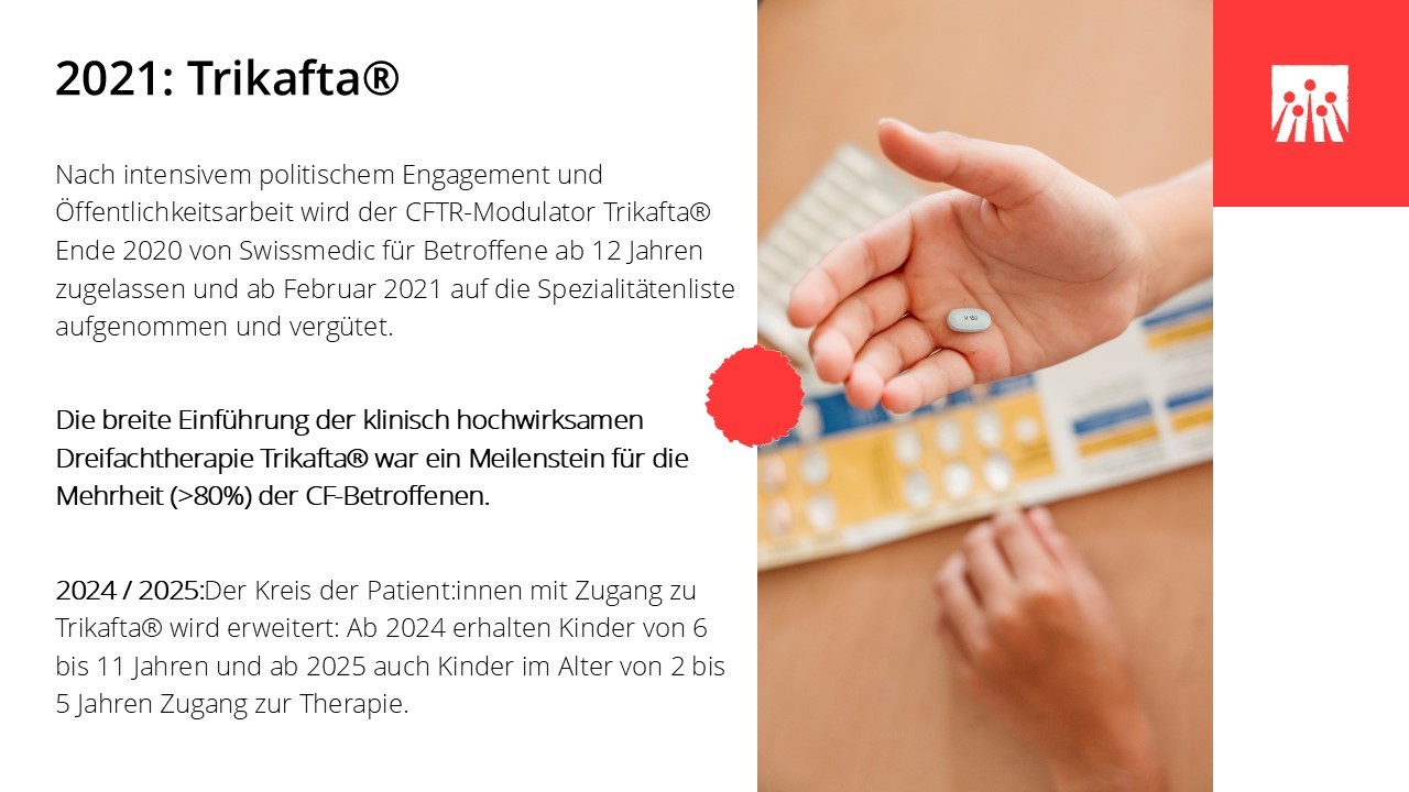 In den vergangenen sechs Jahrzehnten hat sich das Leben mit Cystischer Fibrose grundlegend verändert. Medizinische Durchbrüche, spezialisierte Behandlungszentren und neue Therapien haben die Lebensqualität und die Lebenserwartung vieler Betroffener deutlich verbessert. Entscheidend dafür waren ein wachsendes Verständnis der Krankheit, wirksamere und gezieltere Medikamente und spezifische Therapien wie Pankreasenzyme, Antibiotika und Inhalationstherapien, die Weiterentwicklung der Atemphysiotherapie und der hochkalorischen Ernährung, die Möglichkeit der Lungentransplantation sowie der Aufbau interdisziplinärer CF-Zentren. In den letzten Jahren haben insbesondere die CFTR‐Modulatoren die Behandlung grundlegend verändert, da sie erstmals direkt an der Ursache der Erkrankung ansetzen.